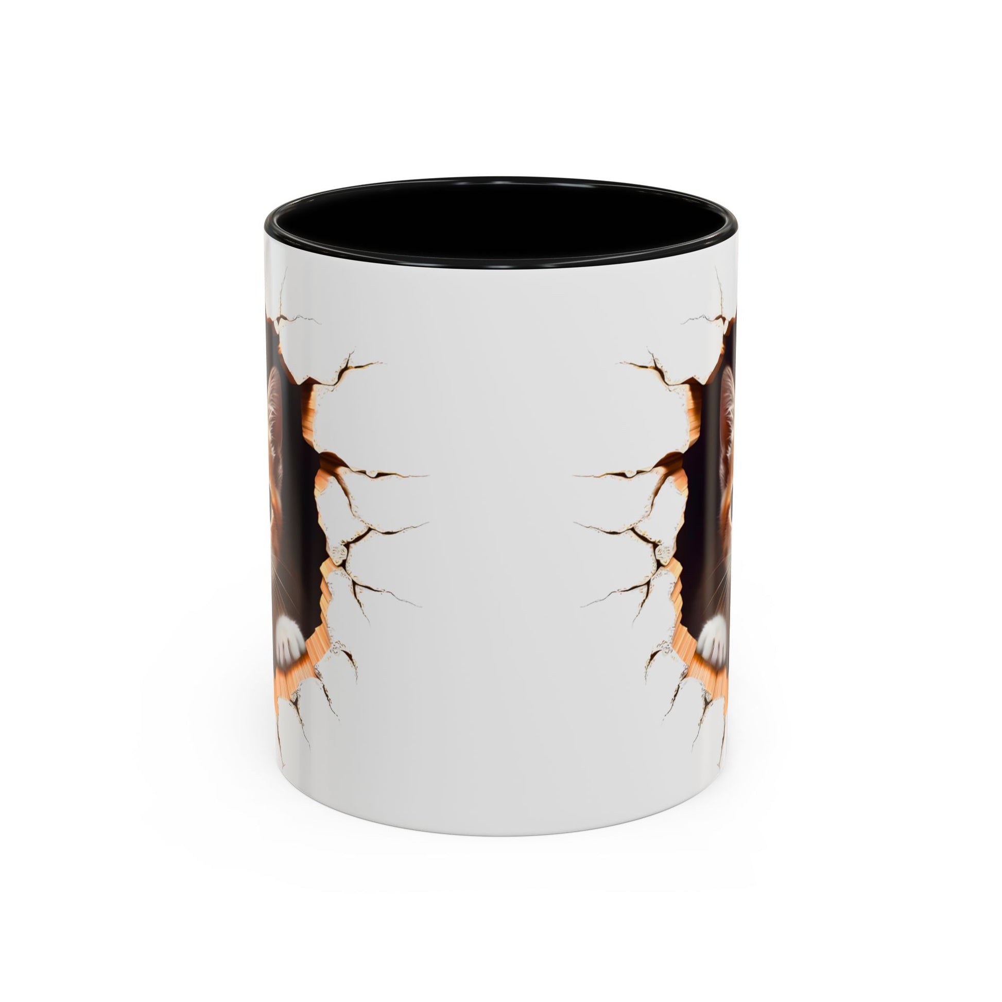 This unique 11oz ceramic mug features a 3D-style broken wall effect with adorable cats peeking through — giving it a realistic and eye-catching look 😻.