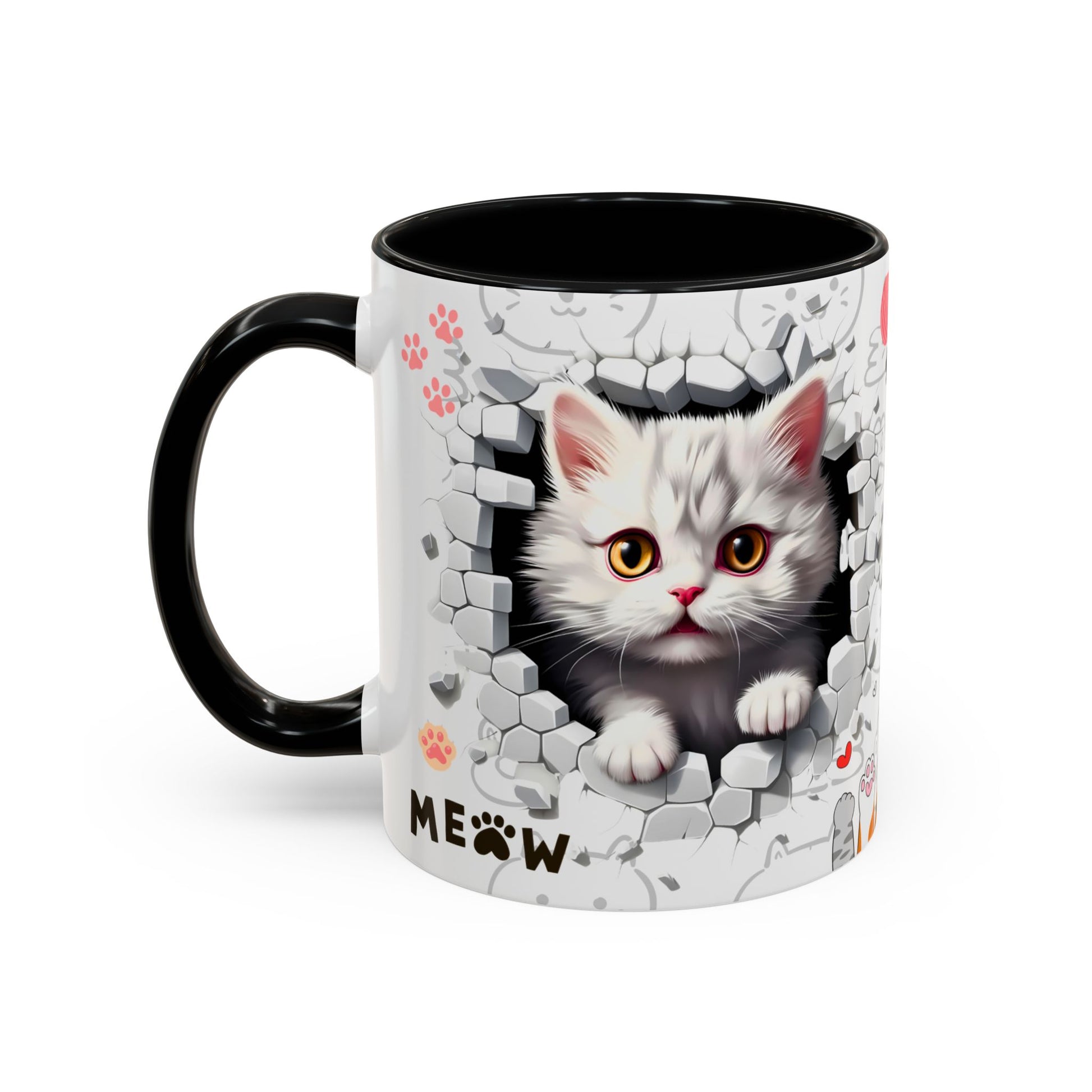 This unique 11oz ceramic mug features a 3D-style broken wall effect with adorable cats peeking through — giving it a realistic and eye-catching look 😻.